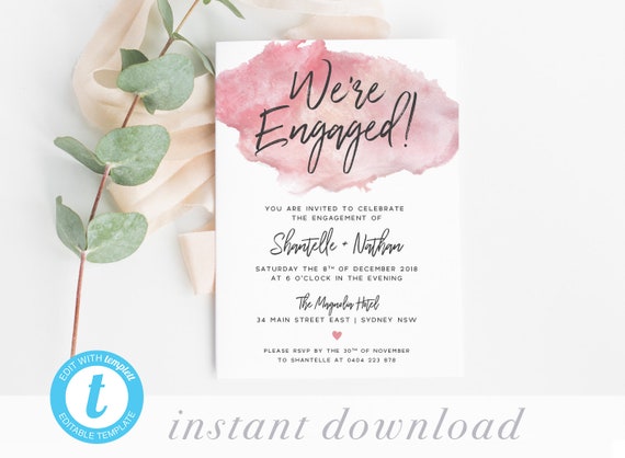 Engagement Party Invite Template Printable Editable Invitations Engagement Invitation Diy We Re Engaged Pink Watercolour